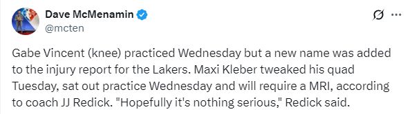 可是湖人又伤一人,湖人队记Dave McMenamin报道,湖人主帅雷迪克透露,克莱伯在周三的训练中拉伤了股四头肌,今日没有参加训练,他将需要接受MRI检查,雷迪克希望他的伤势没什么大碍。
